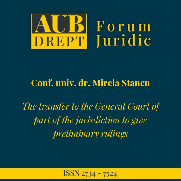 În A.U.B.D. – Forum Juridic nr. 1/2026 a fost publicat discursul susținut de conf. univ. dr. Mirela Stancu, judecător în cadrul Tribunalului, intitulat „The transfer to the General Court of part of the jurisdiction to give preliminary rulings”, cu ocazia evenimentelor dedicate conferirii titlului de Doctor Honoris Causa domnului profesor dr. Koen Lenaerts, președintele Curții de Justiție a Uniunii Europene, desfășurate în cadrul Facultății de Drept a Universității din București la data de 27 martie 2026.